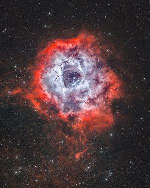 The Rosette Nebula (NGC 2237), a cosmic masterpiece that will transport you to the depths of celestial beauty. Located in the constellation Monoceros, this emission nebula displays vibrant hues of red, pink, and blue, emanating from its swirling clouds of gas and dust. At the heart of the Rosette Nebula lies a cluster of young, hot stars, illuminating the surrounding material and creating a celestial rose blooming in the vastness of space. Display this extraordinary print and let the Rosette Nebula captivate your imagination, evoking a sense of wonder and appreciation for the awe-inspiring beauty that exists beyond our world.
