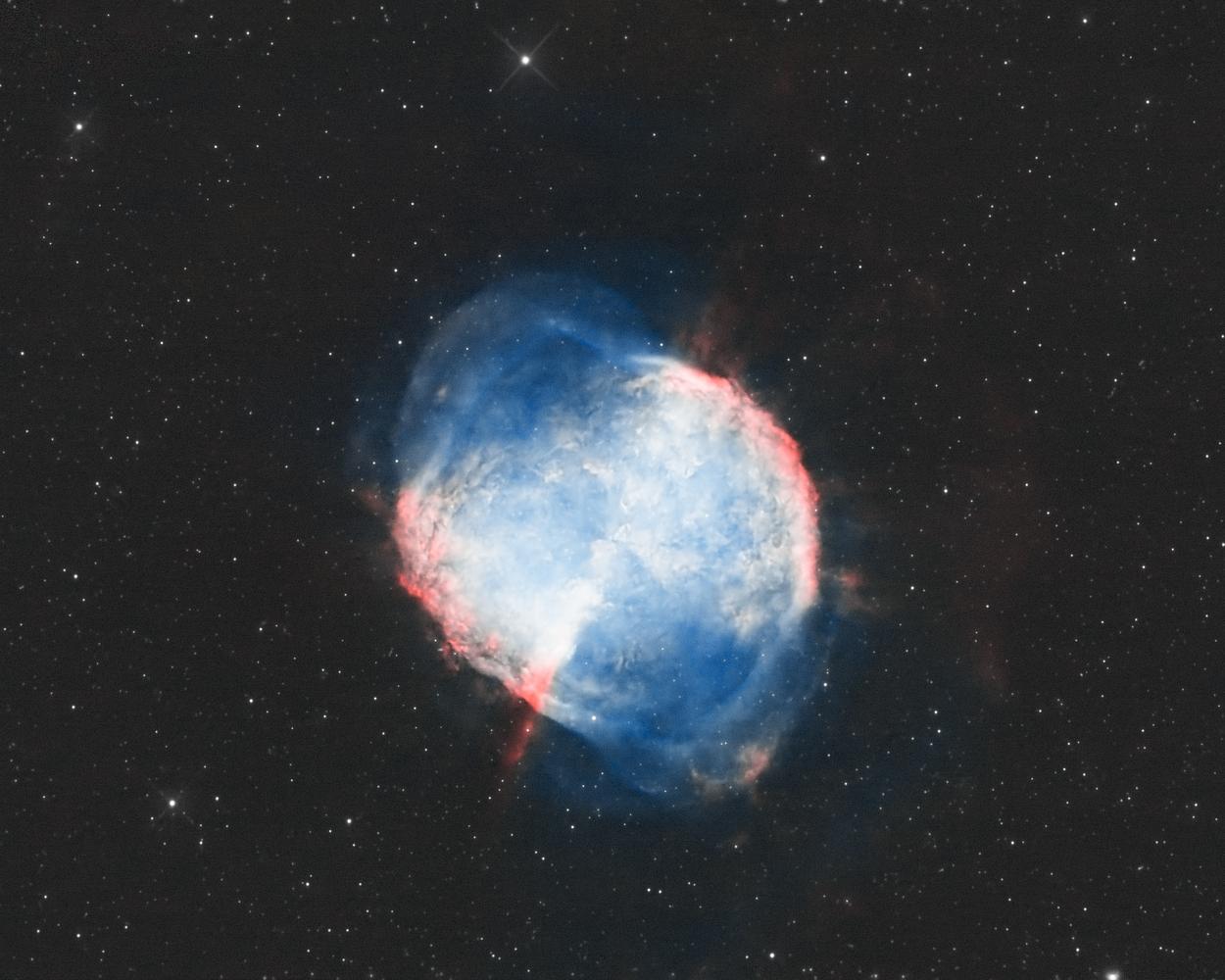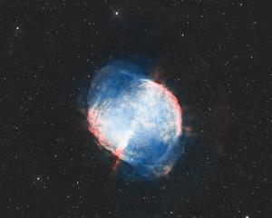 The Dumbbell Nebula (Messier 27), a celestial wonder that will transport you to the depths of the cosmos. With its distinct dumbbell-shaped appearance, this planetary nebula enchants with its ethereal beauty. Formed from the outer layers of a dying star, the Dumbbell Nebula glows with vibrant colors, revealing intricate details and intricate structures. Located approximately 1,360 light-years away in the constellation Vulpecula, this cosmic gem spans about 2.5 light-years in diameter. Display this extraordinary print and immerse yourself in the mesmerizing allure of the Dumbbell Nebula, a stunning reminder of the evolving nature of stars and the breathtaking beauty that exists throughout the universe.