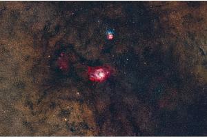 Adjacent to the Lagoon Nebula, the Trifid Nebula (M20) enchants with its complex blend of emission, reflection, and dark nebulae. Its name reflects the three prominent dark dust lanes that divide the nebula into distinct sections. The Trifid Nebula showcases a vibrant mix of colors, with glowing hydrogen gas, blue reflection nebulae, and dark lanes of cosmic dust. It serves as a stellar nursery, giving birth to new generations of stars amidst the surrounding gas and dust.
