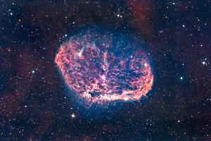 A a close-up view of the Crescent Nebula (NGC 6888) captured in mesmerizing narrowband colors. Immerse yourself in the intricate beauty of this celestial gem, located in the constellation Cygnus. The Crescent Nebula is a complex and dynamic emission nebula formed by the stellar winds from a massive Wolf-Rayet star. Its distinctive crescent shape, accentuated by the narrowband technique, reveals intricate filaments, shockwaves, and ionized gas regions that create a celestial masterpiece. Display this extraordinary print and let the close-up view of the Crescent Nebula transport you to the heart of cosmic dynamics, evoking a sense of wonder and appreciation for the cosmic wonders that lie within our reach.